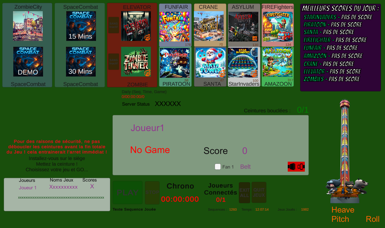 Notre programme de contrôle permet aux joueurs de choisir leur jeu préféré, chacun pouvant jouer à un jeu différent lors de la même session. Le serveur affiche les scores et les classements, et la plateforme se commande directement en un clic, sans besoin d’opérateurs dédiés. Les joueurs s’assoient, attachent leur ceinture, mettent le casque, sélectionnent leur jeu.